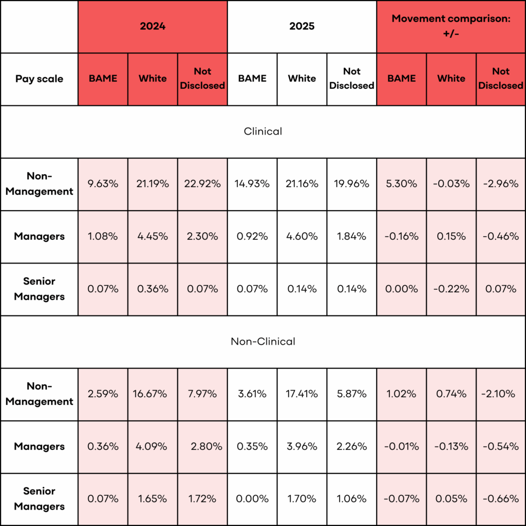 Table 3: Percentage comparison of the workforce, analysed by Clinical and Non-Clinical colleagues, pay band and ethnicity 31st March 2024 and 31st March 2025