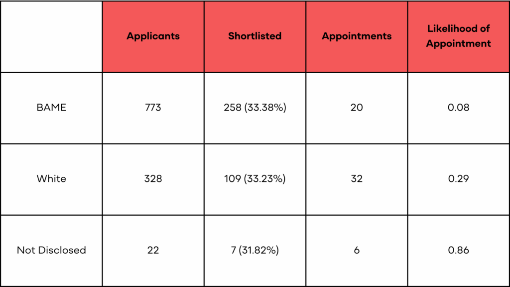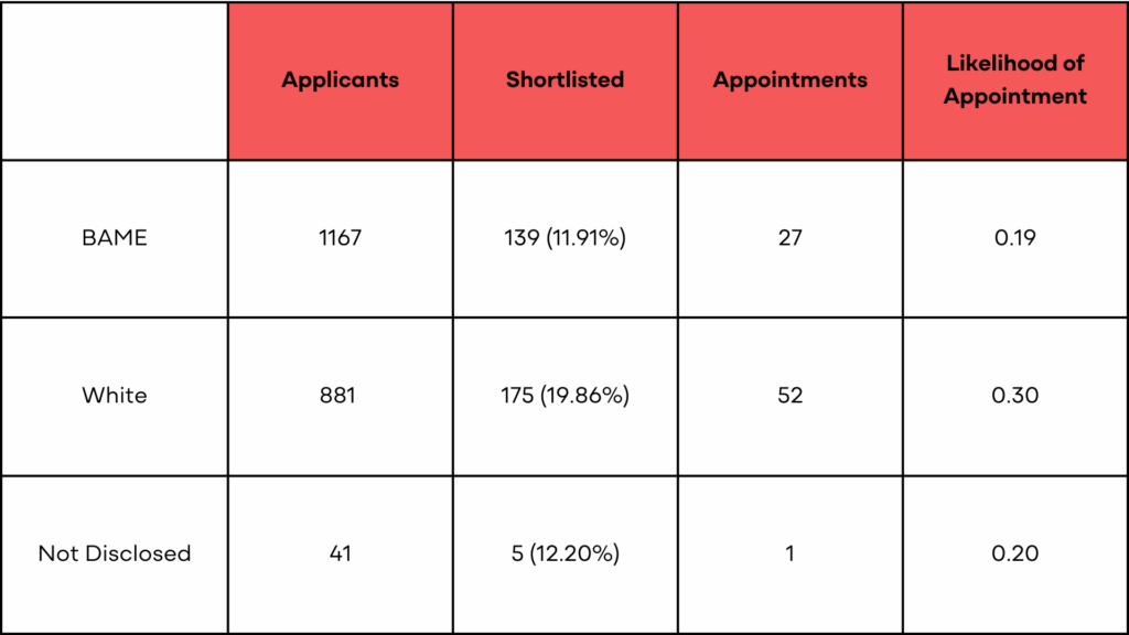 In comparison with the overall workforce, 49% white colleagues (66% disciplinary) and 20% BAME (11% disciplinary).
